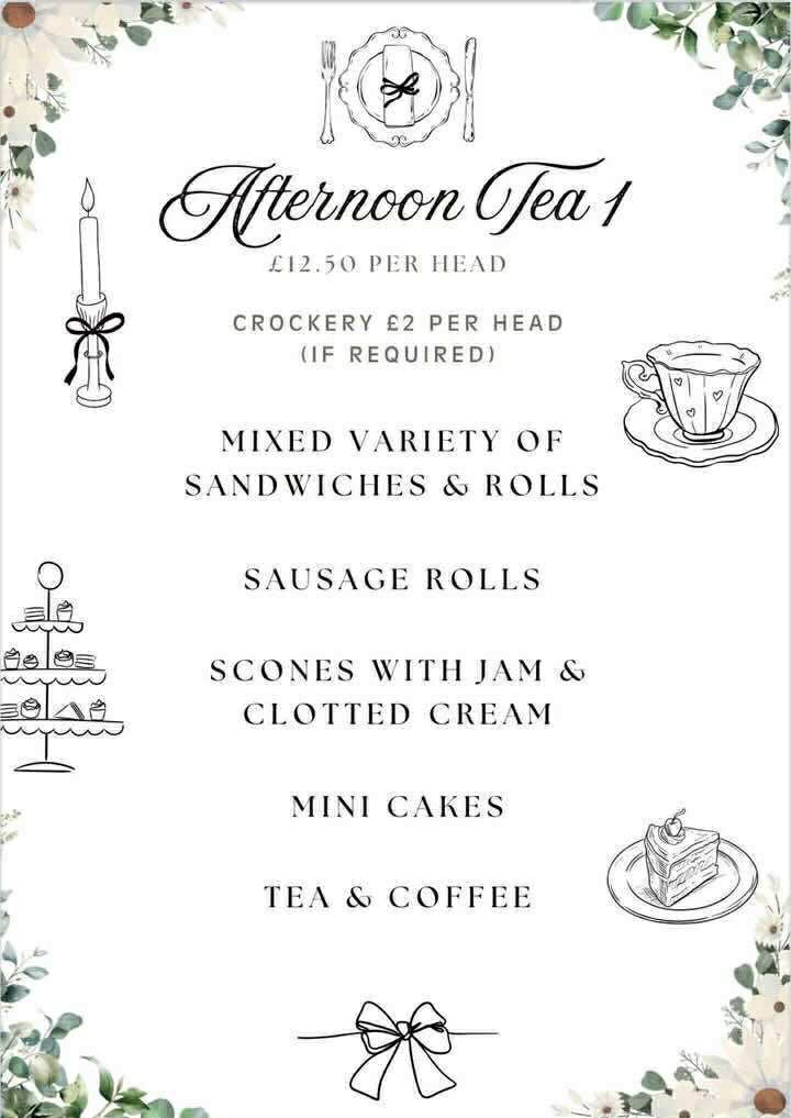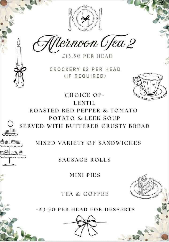Afternoon Tea 2Order Now£13.50 per head (crockery is an additional £2 per head if required) - Choice of soup - Lentil, Roasted Red Pepper & Tomato, Potato & Leek. Served with buttered crusty bread.